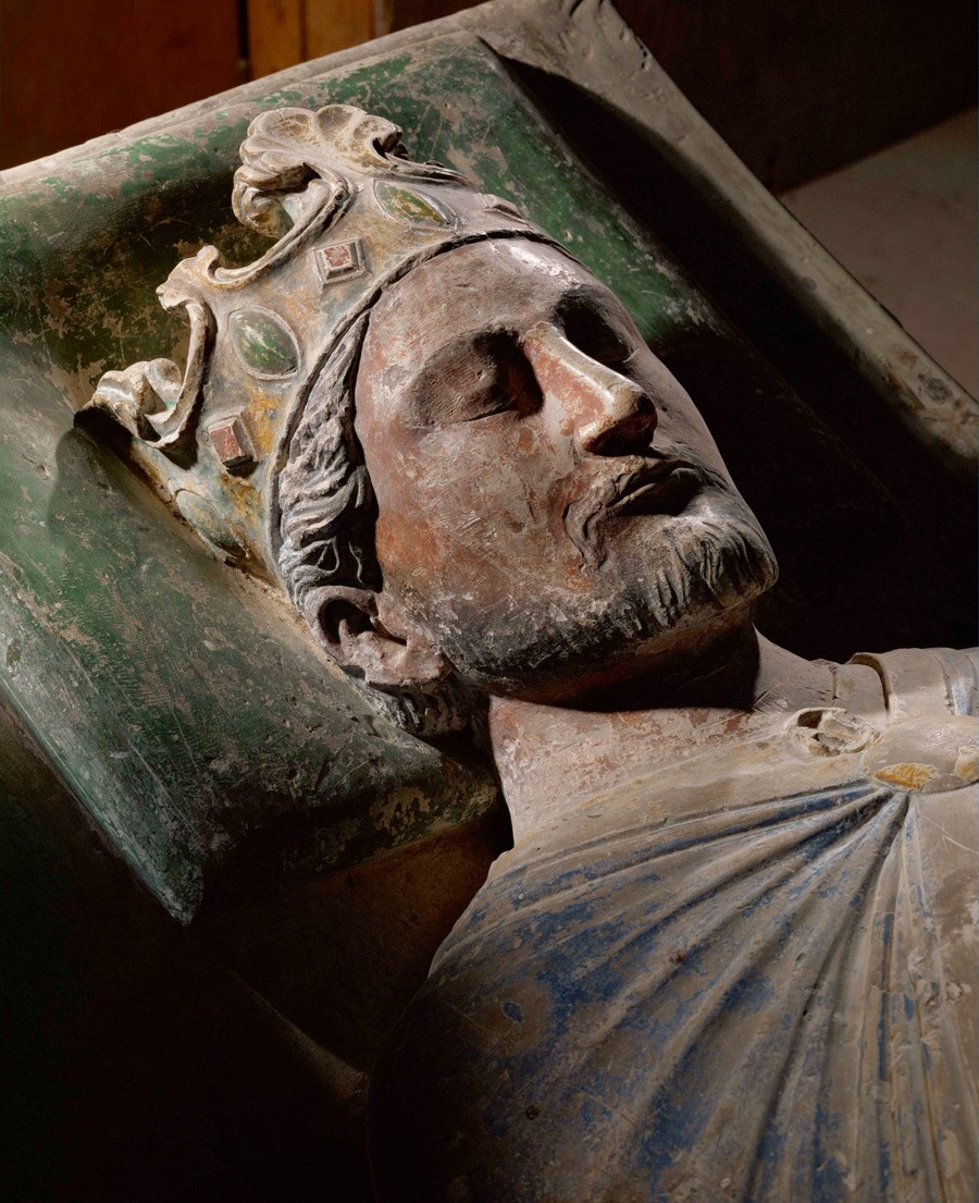 Richard I of England lies next to his mother Eleanor. He requested to lie at the feet of his father Henry II at the Abbey of Fontevraud (not captured in the photo) as an act of contrition for rebelling against him. All the bodies buried in the Abbey were destroyed during the French Revolution.